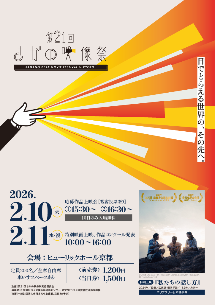 さがの映像祭は、ろう者・難聴者が制作した映像作品を全国から募集・上映し、多様な映像表現を社会に発信する映像祭です。映像作品コンクールや特別上映、関連企画を通して、手話・ろう文化への理解を深めるとともに、映像制作の可能性を広げることを目指しています。