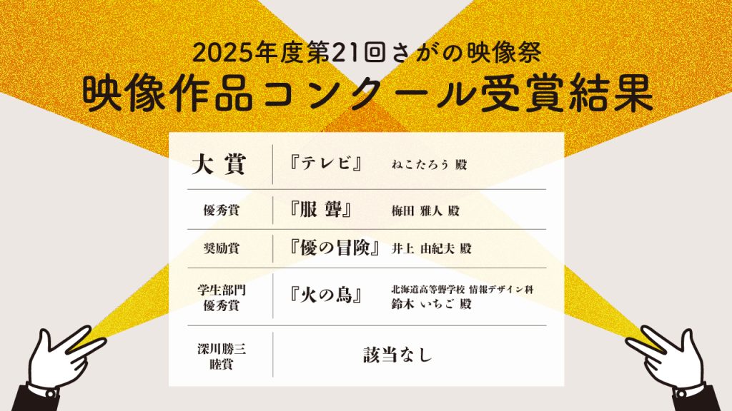 作品コンクール2026年2月開催「第21回さがの映像祭」における映像作品コンクールの受賞結果をお知らせいたします。